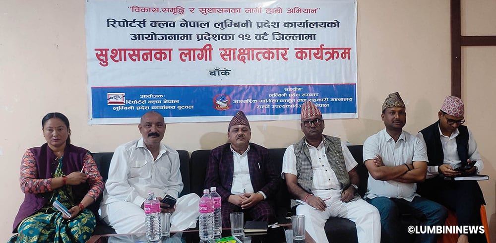 लुम्बिनी प्रदेश आन्तरिक, कानुन तथा सहकारी मन्त्रालयको सहयोगमा रिपोर्टर्स क्लब, लुम्बिनी प्रदेश शाखाले आज नेपालगञ्जमा आयोजना गरेको सुशासनका लागि साक्षात्कार कार्यक्रममा उनीहरुले सीमित स्रोतका कारण प्रभावकारी कार्य सम्पादन गर्न कठिन भएको समेत औँल्याए ।