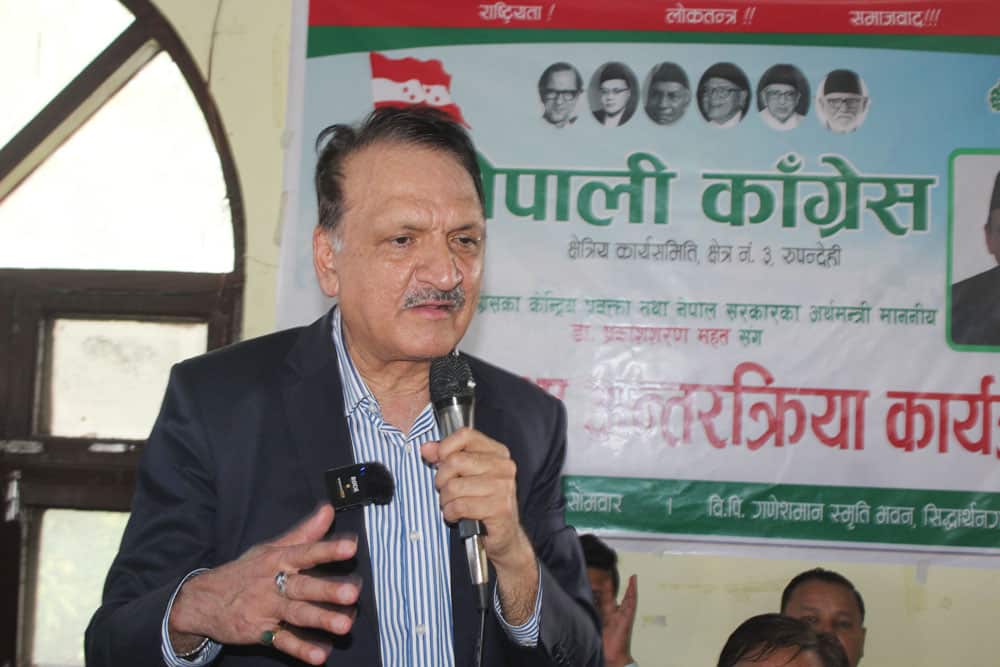 नेपाली कांग्रेस रूपन्देही क्षेत्र नम्बर ३ को क्षेत्रीय समितिले भैरहवामा आयोजना गरेको कार्यक्रममा उनले अत्यावश्यक वस्तुहरूमा आत्मनिर्भरता बढाउनका लागि यस्ता वस्तुको आयातमा कर बढाइने बताए ।