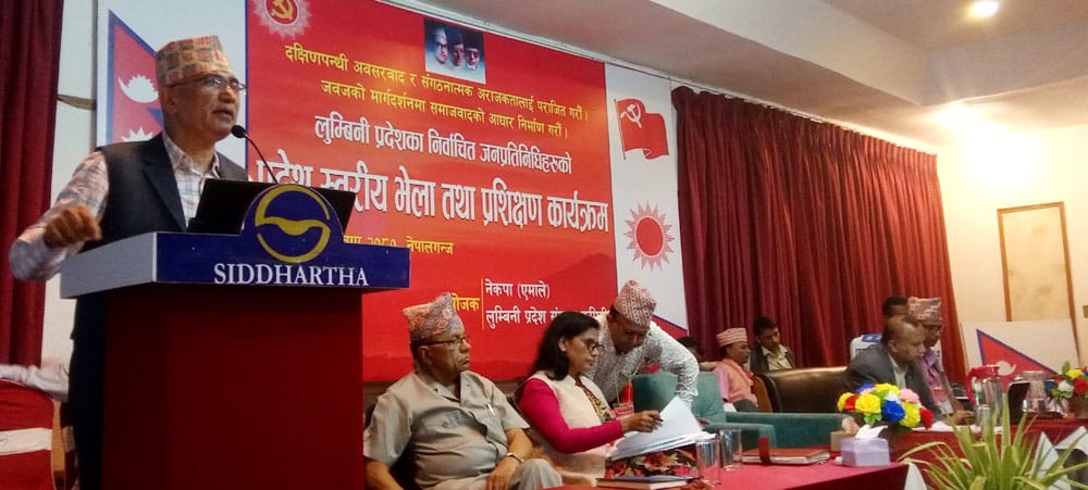 नेकपा (एमाले)कातर्फबाट लुम्बिनी प्रदेशमा निर्वाचित जनप्रतिनिधिलाई नेपालगञ्जमा आयोजित प्रशिक्षणमा उनले पार्टीभित्र झागिँदै गएको व्यक्तिवादी प्रवृत्तिलाई निरुत्साहित पार्दै सामूहिक भावका साथ काम गर्नतर्फ जनप्रतिनिधि अग्रसर हुनुपर्नेमा जोड दिए ।