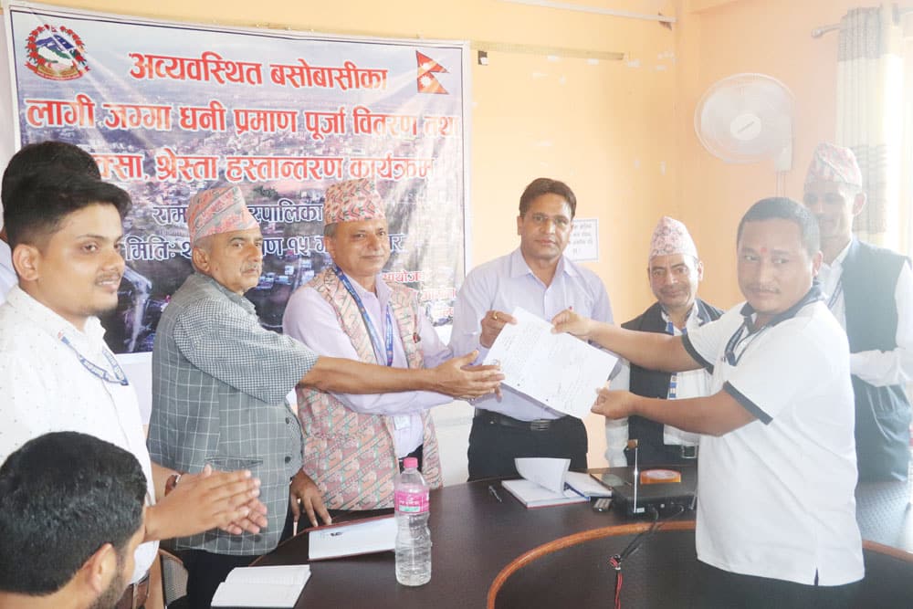 पाल्पा । रामपुर नगरपालिका पाल्पाले अव्यवस्थित बसोबासीका लागि जग्गाधनी प्रमाण पुर्जा वितरणको काम सम्पन्न गरेको छ । नगरपालिकाभित्र सात सय दुई घरघडेरीको जग्गाधनी प्रमाण पुर्जा वितरण भएको छ ।