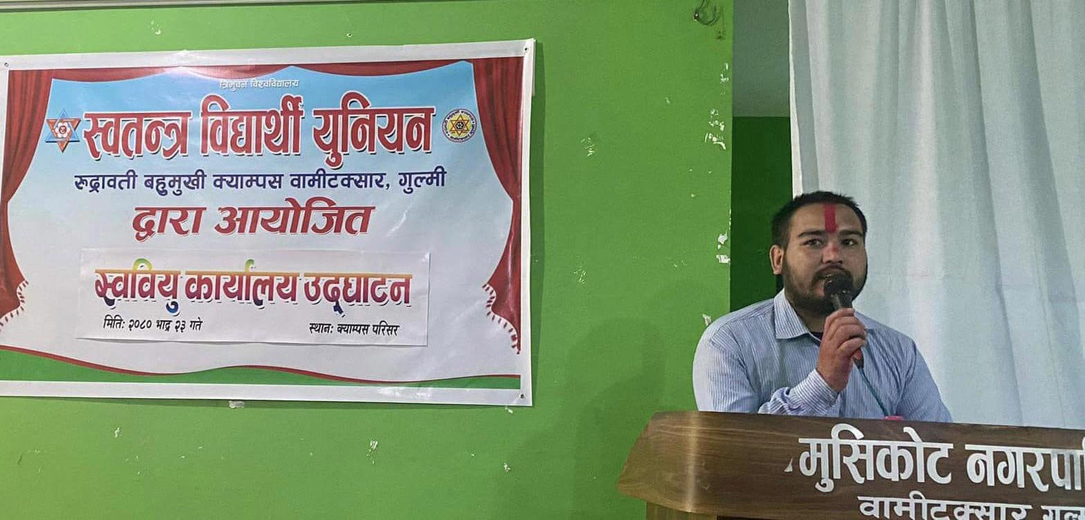 गुल्मी । स्वतन्त्र विद्यार्थी युनियन रुद्रावती बहुमुखि क्याम्पस वामीटक्सारले आफ्नो कार्यालय स्थापना गरेको छ । त्रिभुवन विश्व विद्यालय अन्तरगको सामुदायिक क्याम्पस रुद्रावतिमा नयाँ स्ववियू टिम निर्वाचित भएसंगै कार्यालय स्थापना गरिएको हो ।