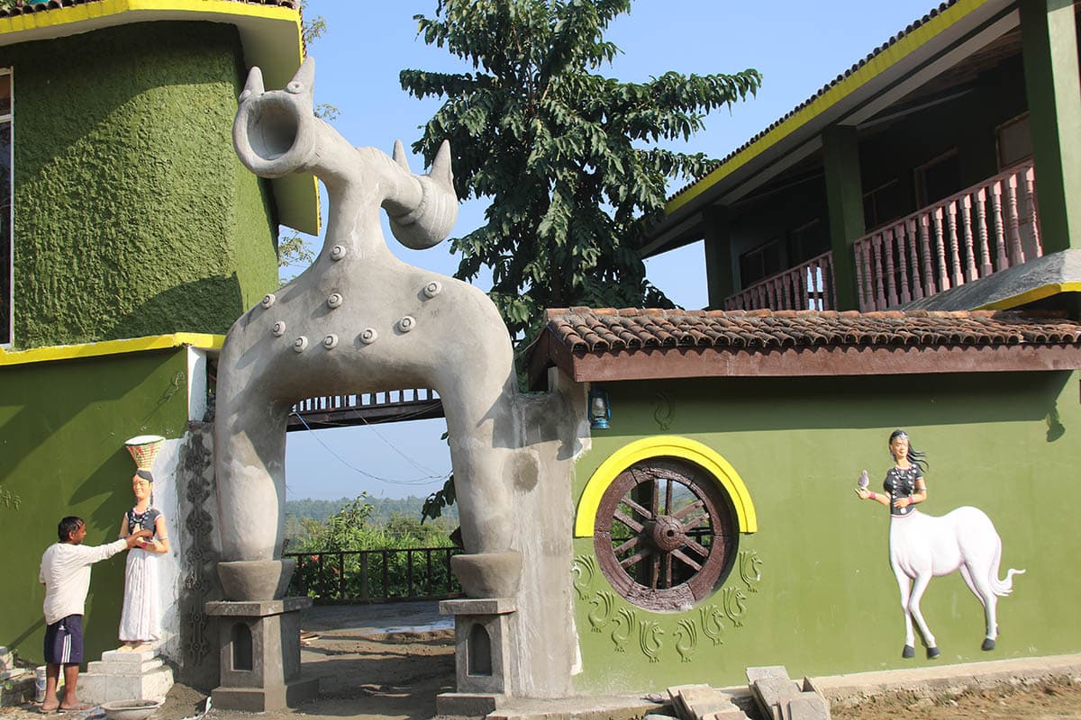 उनले दुर्गाशरणको कथामा आधारित थारु समुदायका देवी मयारी (अप्सरा), थारुका राजा (दगीशरण), भेंवाँ (भीम), ठूलो डेमन डेउडा घोडालगायत माटाका मूर्ति कुँदेर होमस्टेका भित्ता सजाइरहेका छन् ।