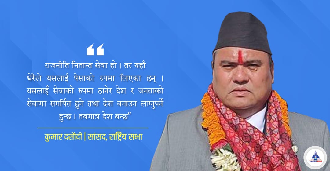 “राजनीति नितान्त सेवा हो । तर यहाँ धेरैले यसलाई पेसाको रुपमा लिएका छन् । यसलाई सेवाको रुपमा ठानेर देश र जनताको सेवामा समर्पित हुने तथा देश बनाउन लाग्नुपर्ने हुन्छ । तबमात्र देश बन्छ”, सांसद दसौदीले भने।