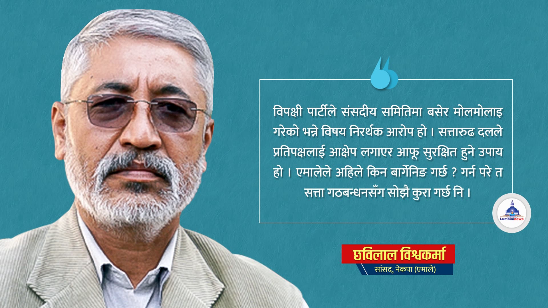 एक प्रसङ्गमा उनले भने, “विपक्षी पार्टीले संसदीय समितिमा बसेर मोलमोलाइ गरेको भन्ने विषय निरर्थक आरोप हो । सत्तारुढ दलले प्रतिपक्षलाई आक्षेप लगाएर आफू सुरक्षित हुने उपाय हो । एमालेले अहिले किन बार्गेनिङ गर्छ ? गर्न परे त सत्ता गठबन्धनसँग सोझै कुरा गर्छ नि ।”