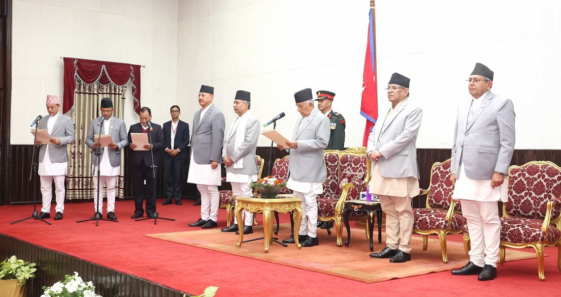 एमालेबाट पदम गिरी, माओवादीबाट हितबहादुर तामाङ र रास्वपाबाट डोरप्रसाद अर्यालले मन्त्री पदको शपथ लिएका हुन् । उनीहरूलाई शीतल निवासमा राष्ट्रपति रामचन्द्र पौडेलले पद तथा गोपनीयताको शपथ दिलाएका हुन् ।