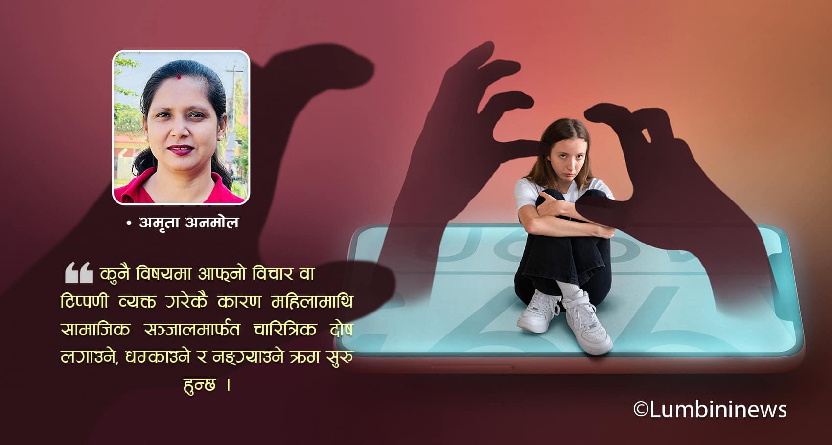 [perfectpullquote align=”right” bordertop=”false” cite=”” link=”” color=”” class=”” size=””]अनलाइनका प्लेटफर्महरुको प्रयोग गरेर डरत्रास देखाउने, धाकधम्कीका सन्देश पठाउने, सहमतिबना निजी पहिचान र यौनजन्य सामग्री पठाउनेलगायतका गतिविधिले महिलामाथि अनलाइन हिंसा बढाइरहेको छ ।[/perfectpullquote]