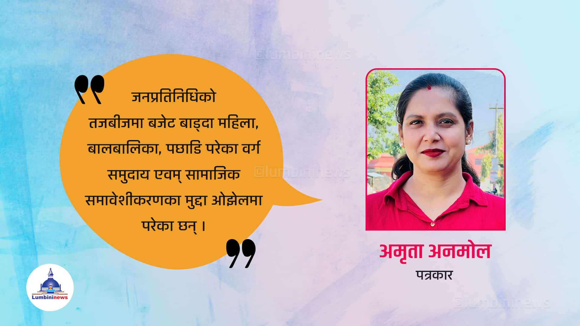 सङ्घीयतामै लैङ्गिक र समावेशी बजेट घट्नु र मुद्दा ओझेलमा पर्नु लाजमर्दो कुरा हो । दिगो विकासको लक्ष्यमा पुग्न र मानव विकास सूचकाङ्क बढाउन लैङ्गिक तथा समावेशी विकास जरुरी छ । लक्षित वर्गले सहज रुपमा आफ्ना आवाज र गुनासो सुनाउन सक्ने स्थानीय तह नै हो ।