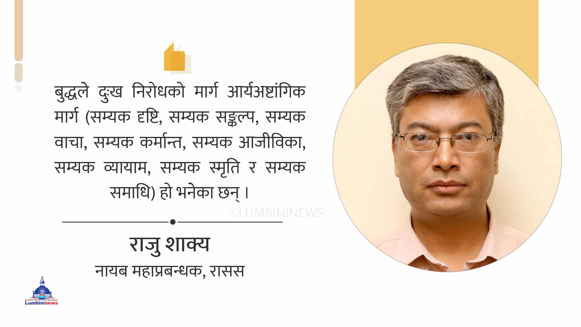 जबसम्म पञ्चस्कन्धरुपी शरीर रहन्छ, दुःख हट्दैन । बुद्धले दुःख निरोधको मार्ग आर्य अष्टांगिक मार्ग हो भनेर बताउनुभएको छ । ती हुन्– सम्यक दृष्टि, सम्यक सङ्कल्प, सम्यक वाचा, सम्यक कर्मान्त, सम्यक आजीविका, सम्यक व्यायाम, सम्यक स्मृति र सम्यक समाधि । यसलाई अर्को शब्दमा मध्यम मार्ग पनि भनिन्छ । आज बुद्धद्वारा प्रतिपादित यिनै मध्यम मार्गको चिन्तन मनन् गरी संसारको दलदलबाट मुक्त हुन प्रण गर्ने दिन हो ।