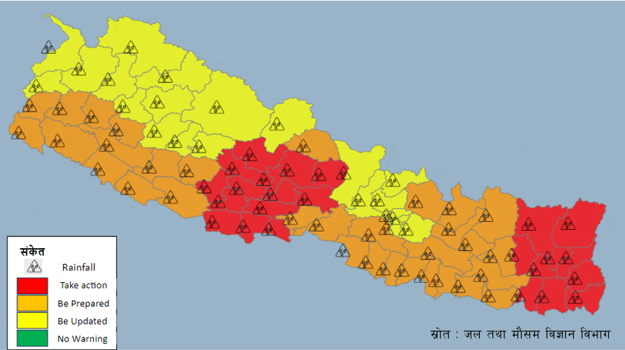 साथै गण्डकी प्रदेशका केही स्थानहरूमा, कोशी, बागमती, लुम्बिनी र सुदूरपश्चिम प्रदेशका थोरै स्थानहरूमा तथा मधेश र कर्णाली प्रदेशका एक–दुई स्थानमा मेघ गर्जन/चट्याङ्ग सहित भारी वर्षाको सम्भावना छ ।